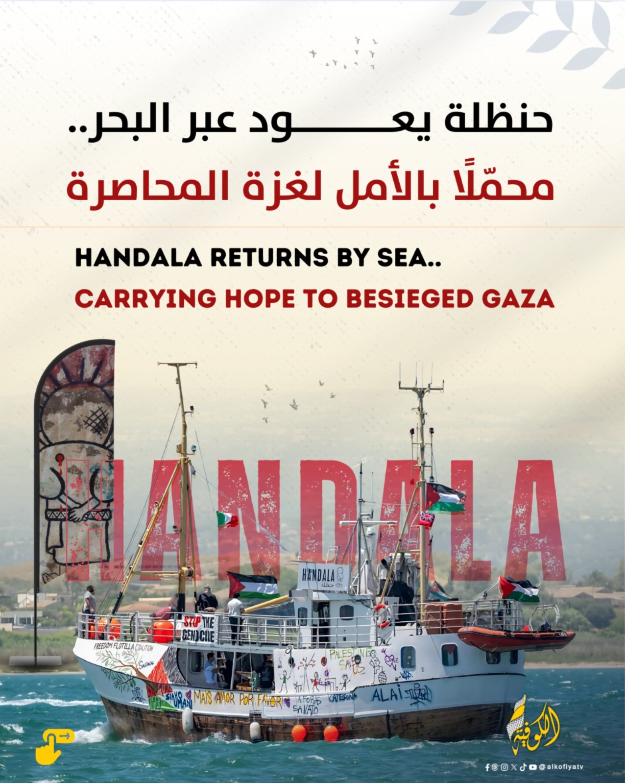 الكوفية تواصل السفينة "حنظلة" إبحارها في البحر المتوسط قادمة من إيطاليا، وقد وصلت حاليًا قبالة سواحل مالطا، في إطار مسعى دولي لكسر الحصار المفروض على قطاع غزة.