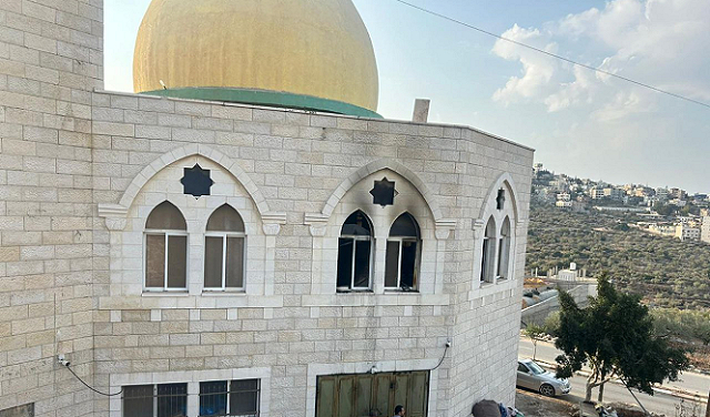 مستوطنون يحرقون مسجدًا غرب سلفيت ويكتبون شعارات عنصرية على جدرانه