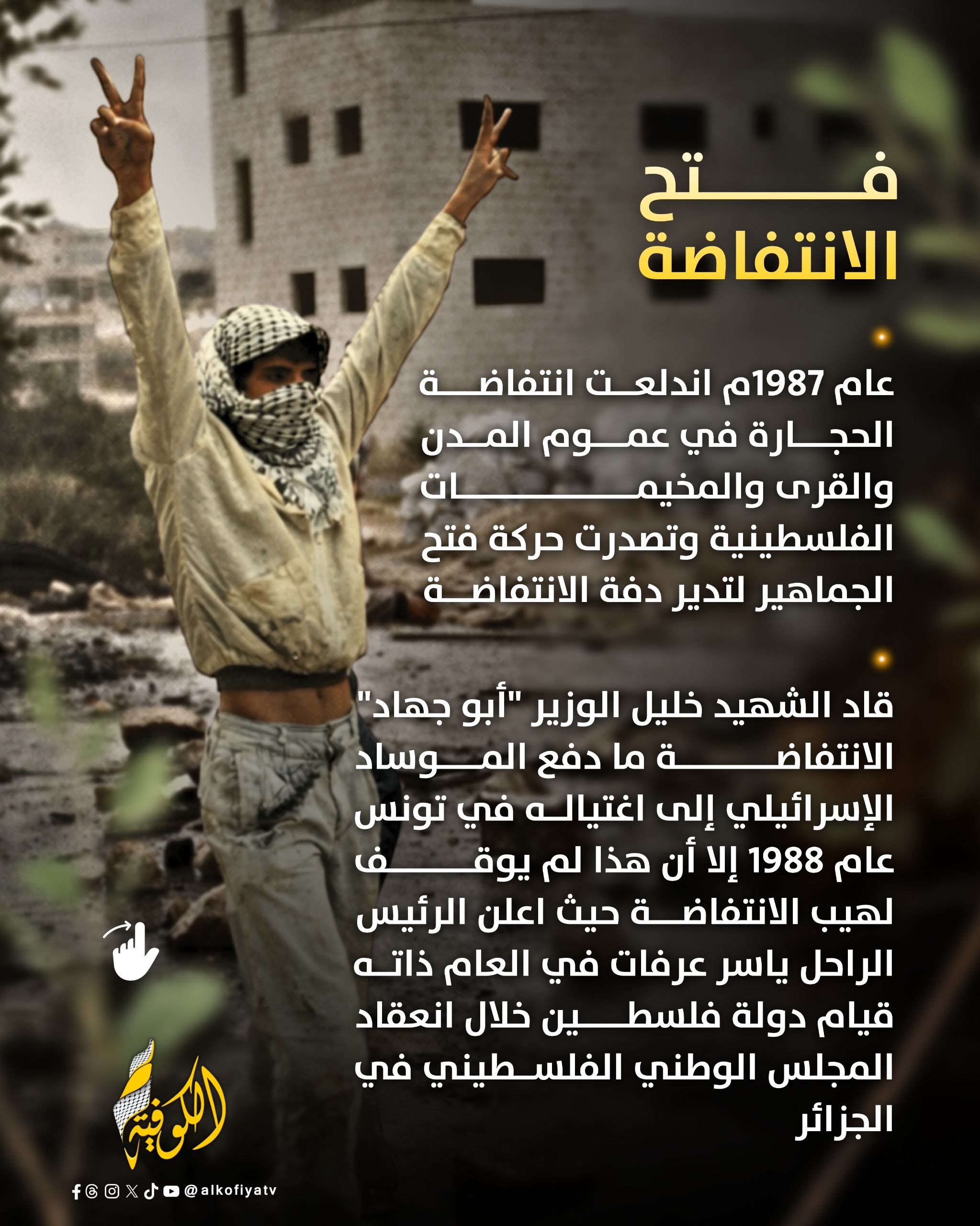 في عام 1987م اندلعت انتفاضة الحجارة التي عمت المدن والقرى والمخيمات الفلسطينية، وتصدرت حركة فتح الجماهير الفلسطينية لتدير دفة الانتفاضة، وكان الشهيد خليل الوزير (أبو جهاد) الموجه والقائد؛ ما دفع بالموساد الإسرائيلي إلى استهدافه واغتياله في تونس، إلا أن هذا لم يوقف لهيب الانتفاضة، فقبل أن تكمل عامها الثاني، كان المجلس الوطني الفلسطيني المنعقد في الجزائر بتاريخ 15 تشرين الثاني 1988م يعلن على لسان الرئيس الراحل ياسر عرفات قيام دولة فلسطين.