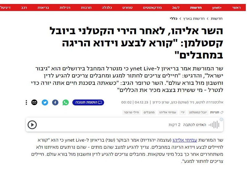 ترجمة خاصة للكوفية: دعا وزير التراث في حكومة الاحتلال عميحاي إلياهو، إلى قتل عناصر المقاومة في غزة وتوثيق العمليات بواسطة مقاطع فيديو يتم نشرها على منصات التواصل الاجتماعي.