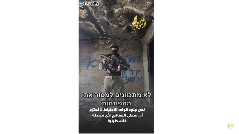وظهر جندي احتياط ملثم داخل ما بدا أنه منزل مهدم بقطاع غزة، ومن خلفه شعارات مكتوبة بالعبرية لحركة "كاخ" المتطرفة في إسرائيل، وفق صحيفة "معاريف" العبرية.