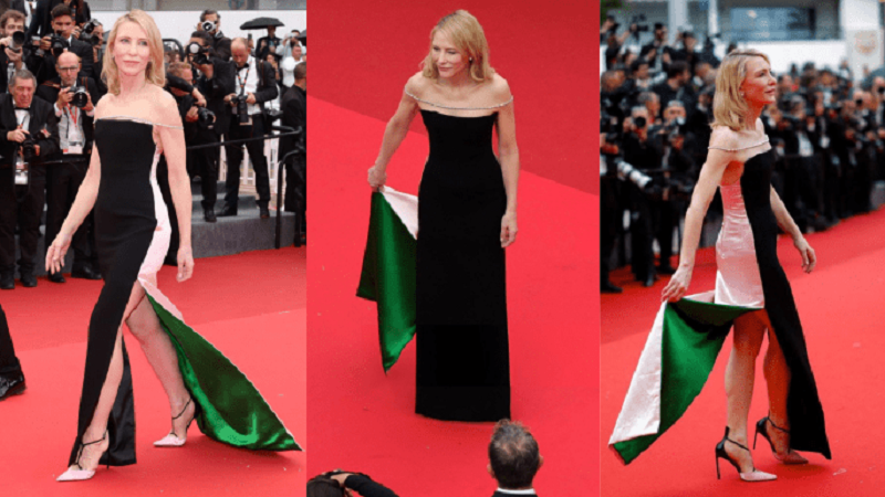 وارتدت بلانشيت فستاناً يعانق الجسم، أسود من الأمام، وزهرياً فاتحاً من الخلف، وبطانة خضراء يمكن رؤيتها من خلال الشقوق، وعندما تزامن مع السجادة الحمراء للمهرجان، اكتملت ألوان العلم الفلسطيني.