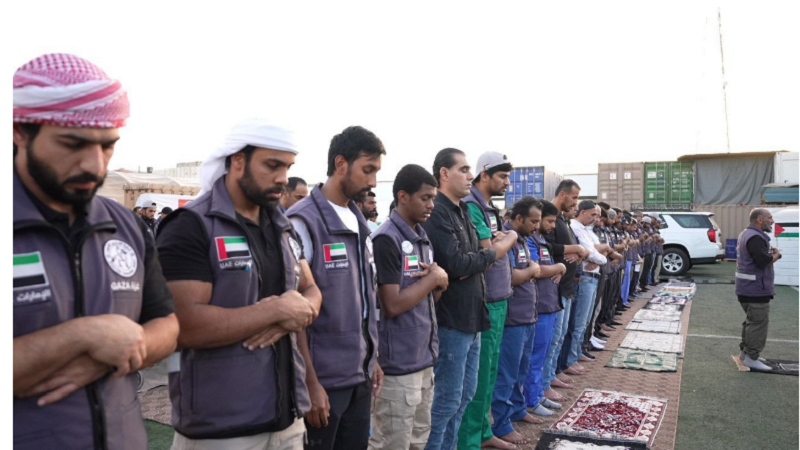 غزة: في لفتة إنسانية ودينية بمناسبة عيد الأضحى المبارك، أدت بعثة دولة الإمارات العربية المتحدة في قطاع غزة ومتطوعو عملية الفارس الشهم 3 والمرضى والمصابين، صلاة عيد الأضحى المبارك في مقر المستشفى الميداني الإماراتي بمدينة رفح جنوب القطاع، حيث شارك الأطباء الإماراتيين وكافة المتطوعين الغزيين في شعائر العيد المبارك، تضامناً مع سكان قطاع غزة وتجسيداً لروح الأخوة في ظل الأوضاع الكارثية التي يعاني منها السكان.