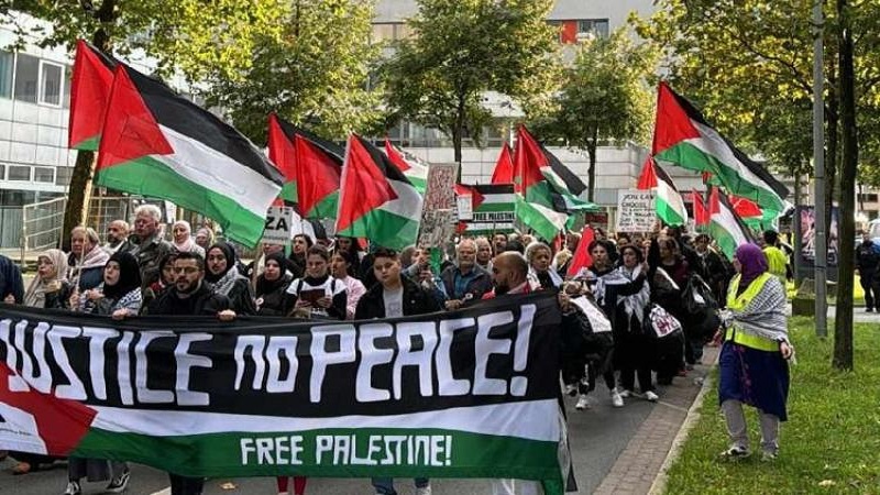ورفع المشاركون في المسيرة العلم الفلسطيني، واللافتات التي تعبر عن التضامن مع الشعب الفلسطيني، المنددة بالجرائم التي يرتكبها جيش الاحتلال بحق الفلسطينيين، وهتفوا بالحرية لفلسطين، والدعوة لوقف حرب الإبادة، مطالبين بإدخال المواد الغذائية والإغاثية والطبية إلى القطاع.