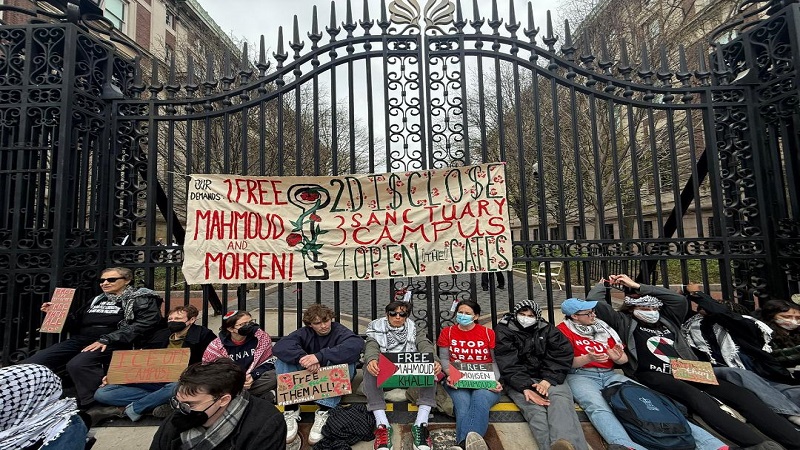 نيويورك - اعتصم عدد من الطلبة في جامعة كولومبيا في مدينة نيويورك، تضامنا مع زملائهم المهددين بالترحيل نظرا لتضامنهم مع فلسطين.