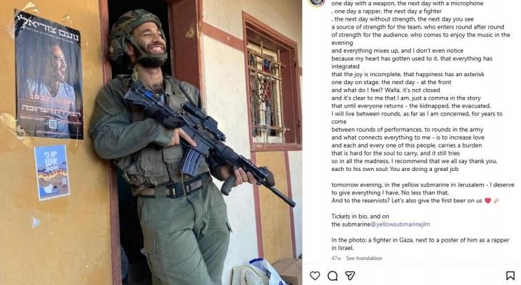 وخلال عرض له في ديسمبر 2024، قدم فنان الراب لقطات حقيقية لقوات إسرائيلية تقتحم منازل فلسطينيين وتهدم مباني، كما غنى في مقابلات تلفزيونية كلمات مثل: "لتحطيم غزة إربا".