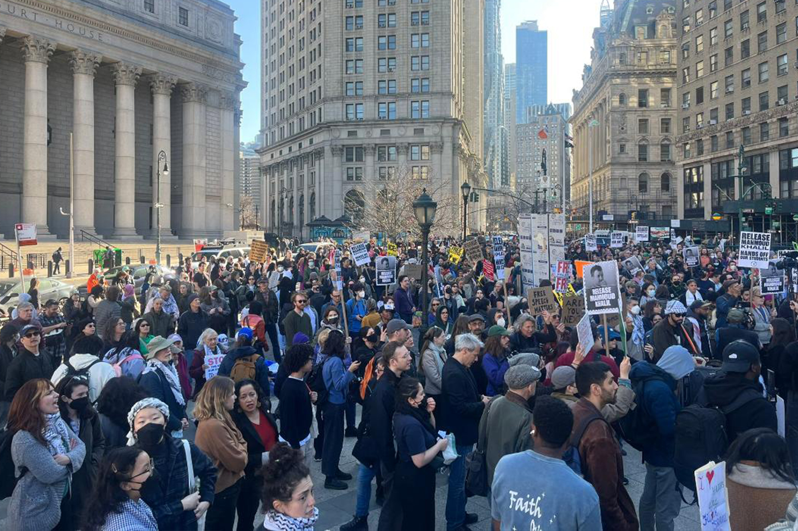 الكوفية نيويورك - تجمع مئات المتظاهرين في ميدان Columbus Circle بحي منهاتن بولاية نيويورك، بمناسبة "اليوم العالمي للتضامن مع الشعب الفلسطيني".