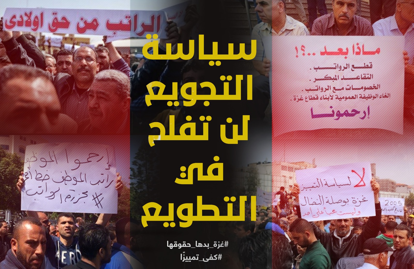 وأوضح، أن فئة العمال الذين ضحوا من أجل وطنهم لا يجب مكافأتهم في نهاية المطاف بهذه السياسة، التي أصبحت مكشوفة أمام الجميع وتمارس منذ 15 عاما بحجة الانقسام.