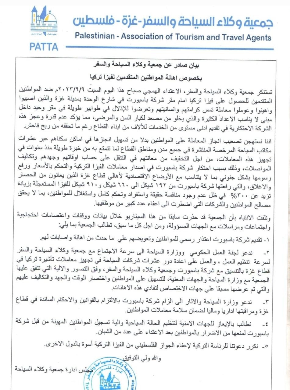أصدرت جمعية وكلاء السياحة والسفر، بيانًا بشأن إهانة المواطنين المتقدمين لفيزا تركيا، مستنكرًة الاعتداء الهمجي عليهم أمام مقر شركة باسبورت في شارع الوحدة بمدينة غزة.