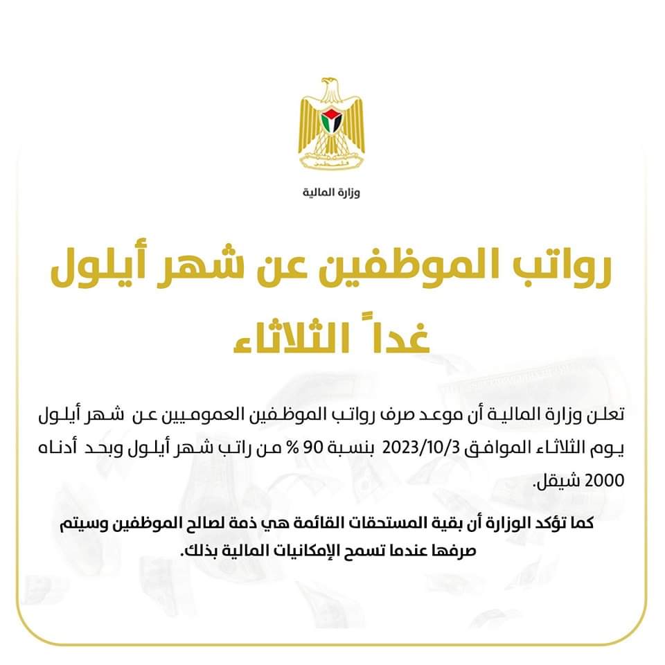أعلنت وزارة المالية أن موعد صرف رواتب الموظفين العموميين عن شهر أيلول، سيكون يوم غدٍ الثلاثاء الموافق 3/10/2023، بنسبة 90 % من راتب شهر أيلول وبحد أدناه 2000 شيقل.