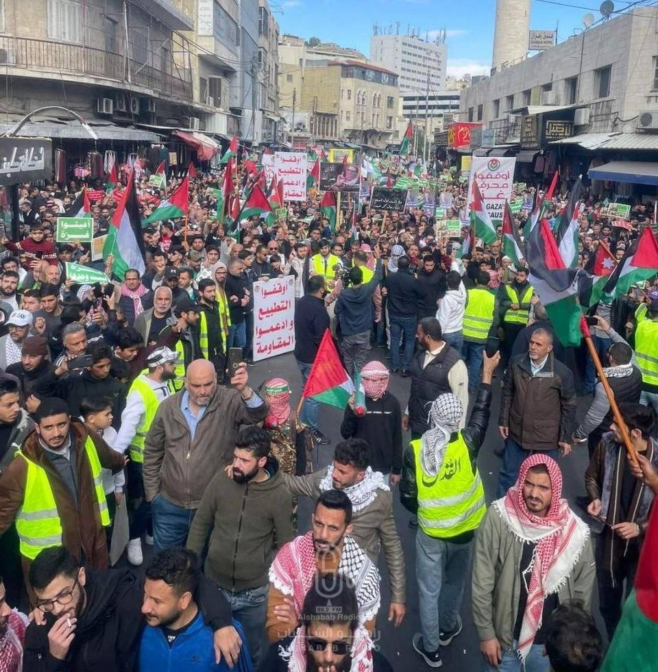 واصل آلاف الأردنيين، في محافظات المملكة، الخروج بمسيرات ووقفات، للجمعة الـ13 على التوالي، تضامنا ودعما لفلسطين، وتنديدا بالعدوان الإسرائيلي على قطاع غزة.