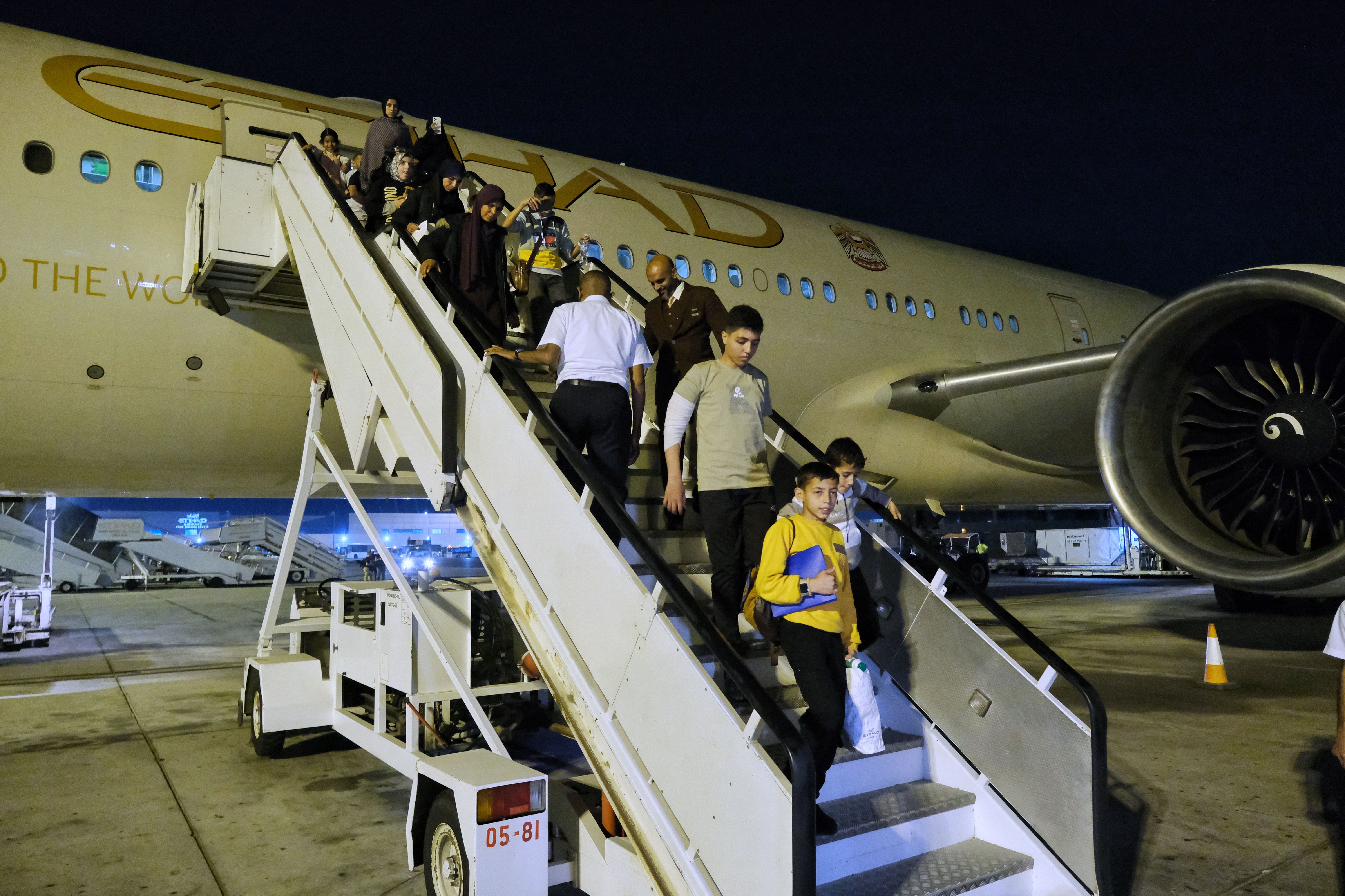 وحطت الطائرة، القادمة من مطار العريش في جمهورية مصر العربية، في مطار زايد الدولي، وعلى متنها 27 من الذين يحتاجون للرعاية الطبية، بالإضافة إلى 60 مرافقاً من عائلاتهم.