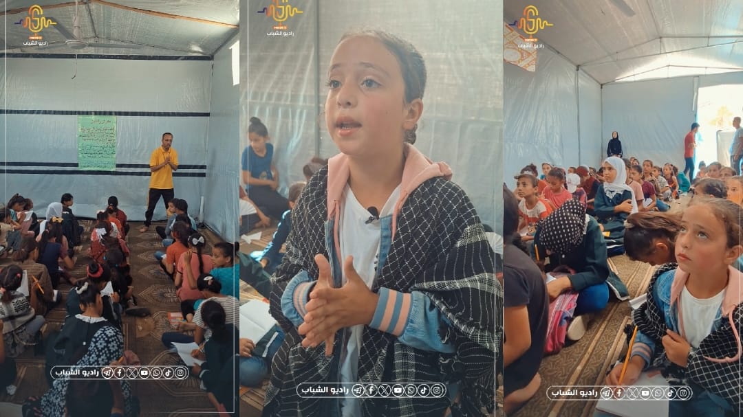 بالفيديو// خلال حصة مدرسية في خيمة نزوح.. الطفلة زينة قريقع تروى معاناتها